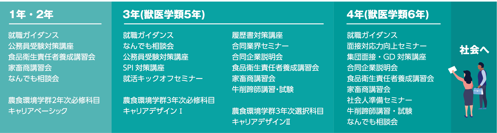 酪農学園大学のキャリア教育は、人が生涯の中で様々な役割を果たす過程で、自らの役割の価値や自分と役割との関係を見出していく連なりや積み重ねである「キャリア」について学び、考えることを促す授業を展開しています。